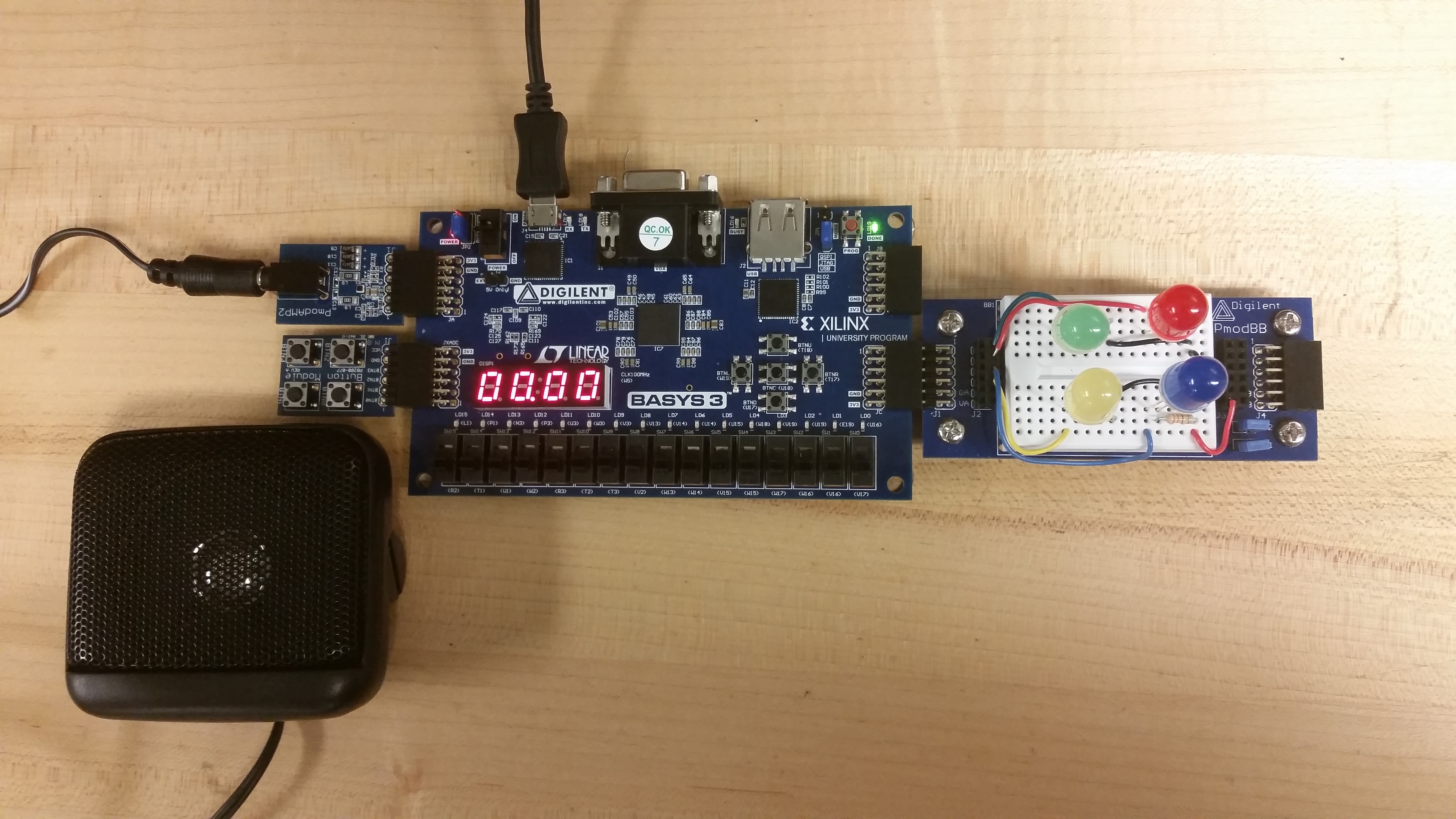 a simon-style memory game on an fpga in vhdl: state machine and controller laid out in a block diagram, then built out so all game behavior lives in the hardware design, not just simulation, with digilent pmods hooking up real inputs and outputs on the board.